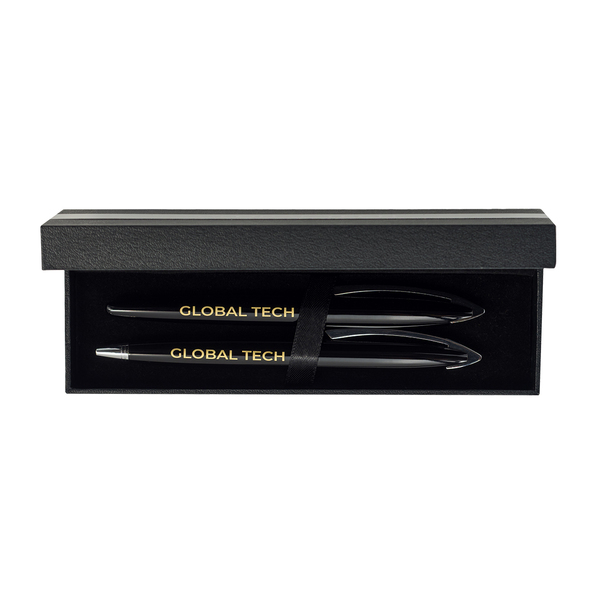 Elegancki zestaw składający się z metalowego długopisu i pióra kulkowego. Wkłady w kolorze niebieskim. Obrotowy mechanizm włączania. Zapakowany w eleganckie pudełko.